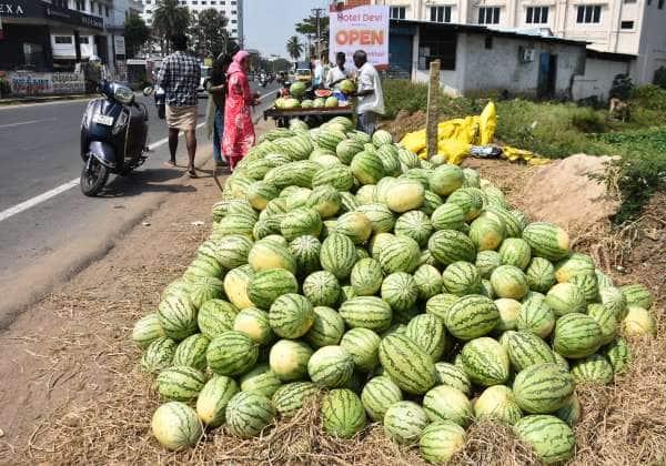 கொடை வெயில் துவங்குவதையொட்டி கடலூரில் விற்பனைக்காக குவிக்கப்பட்டுள்ள தர்பூசணி பழங்கள். இடம்: கடலூர் சிதம்பரம் சாலை.