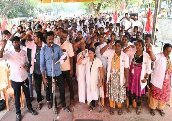 பல்வேறு கோரிக்கைகளை வலியுறுத்தி தமிழ்நாடு ஆரம்ப சுகாதாரத்துறை ஆயிஷா பணியாளர்கள் சங்கத்தினர் எழும்பு ராஜரத்தினம் மைதானம் அருகே போராட்டத்தில் ஈடுபட்டனர்.