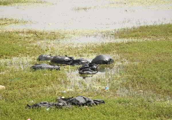 கோவை சுண்டக்காமுத்துர் குளத்தில் மூட்டை மூட்டையாக கொட்டப்பட்டுள்ள குப்பைகள்.