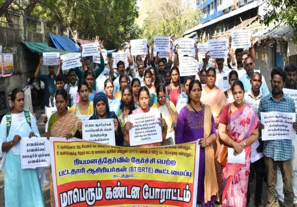 காலி பணியிடங்களை நிரப்பக் கோரி நியமன தேர்வில் தேர்ச்சி பெற்ற பட்டதாரி ஆசிரியர்கள் கூட்டமைப்பு சார்பில் சென்னை கலெக்டர் அலுவலகம் அருகே போராட்டம் நடத்தினர்