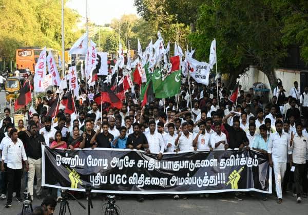 புதிய யு.ஜி.சி. விதிகளை அமல்படுத்த வலியுறுத்தி மாணவர் இயக்கங்களின் கூட்டமைப்பு தமிழ்நாடு (எஃப்.எஸ்.ஓ.டி.என்) அமைப்பு சார்பில் சேப்பாக்கம் சிவானந்தா சாலையில் பேரணி சென்றனர்.
