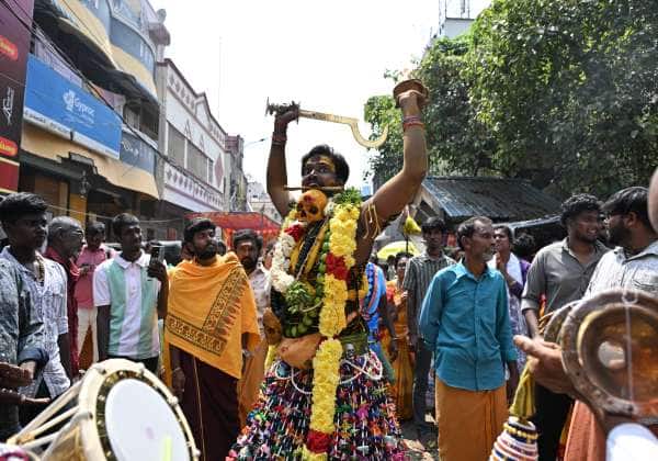 மயானக் கொள்ளையை முன்னிட்டு சூளை அங்காளம்மன் கோவிலில், காளி வேடமிட்டு நேர்த்திக்கடன் செலுத்த வந்த பக்தர்.