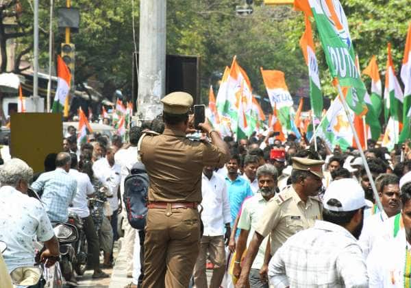 புதுச்சேரியில் காங்கிரஸ் சார்பில் நடந்த பாதயாத்திரியில் அரசு ஊழியர்கள் கலந்து கொள்கிறார்களா என போலீசார் செல்போனில் பதிவு செய்தார்.