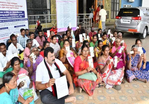 திருப்பூர், கலெக்டர் அலுவலகத்தில் பல்லடம் தாலுகா இச்சிப்பட்டி கிராம மக்கள் தங்களுக்கு வழங்கிய இலவச பட்டாவிற்கு இடம் ஒதுக்க வலியுறுத்தி தர்ணா போராட்டத்தில் ஈடுபட்டனர்.