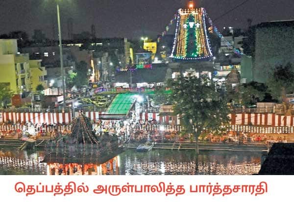 சென்னை திருவல்லிக்கேணி பார்த்தசாரதி பெருமாள் கோவிலில், மாசி மாத ஏழு நாள் தெப்ப உற்சவம் துவங்கியது. முதல்நாளில் ஸ்ரீதேதி, பூதேவி நாச்சியாருடன் பார்த்தசாரதி பெருமாள் தெப்பத்தில் வந்து அருள்பாலித்தார்.