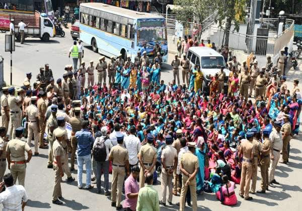 தொடர் போராட்டம் நடத்தி வரும் சத்துணவு பணியாளர்கள் திருப்பூர் ரயில்வே ஸ்டேஷன் முன் மறியல் போராட்டத்தில் ஈடுபட்டனர்.