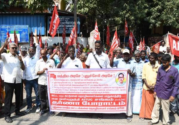 புதுவை மாநில கட்டட தொழிலாளர் ஏ.ஐ.டி.யு.சி.,சங்கத்தின் சார்பில் கட்டட தொழிலாளர் நல வாரியம் முன்பு பல்வேறு கோரிக்கைகளை வலியுறுத்தி போராட்டத்தில் ஈடுபட்டனர்.