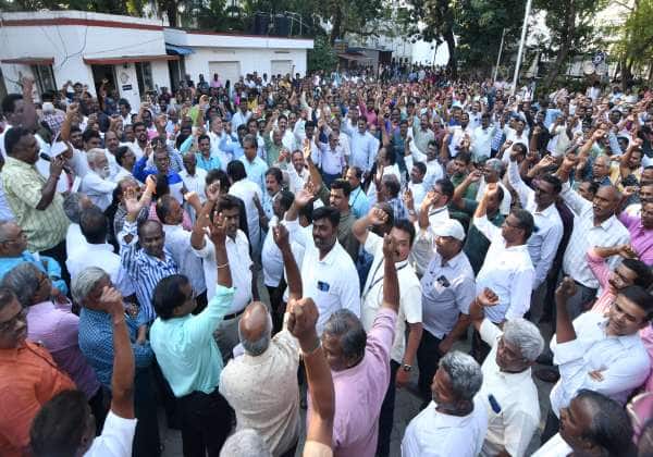 தமிழகத்தில் மின்வாரிய ஊதிய உயர்வு கருத்துக்கு எதிர்ப்பு தெரிவித்து மின்வாரிய பணியாளர்கள் போராட்டத்தில் ஈடுபட்டனர். இடம்: சென்னை மின்வாரிய தலைமை அலுவலகம்.