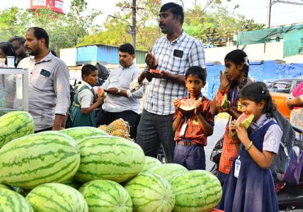 வெயிலின் கொடுமையில் இருந்து தப்பிக்க தர்பூசணி கடையை தேடிச் செல்லும் பொதுமக்கள்இடம் : வின்சென்ட் ரோடு கோவை