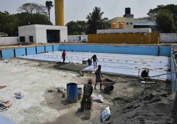 சென்னை மாநகராட்சி நீச்சல் குளம் பராமரிக்கும் பணி நடந்து வருகிறது.இடம்: பெரிய மேடு.