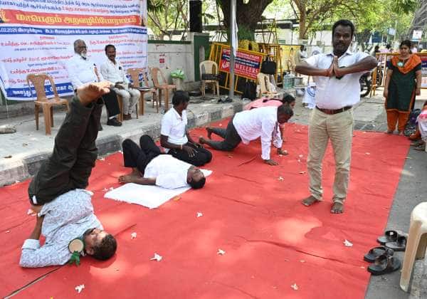 சென்னை எழும்பூர் ராஜரத்தினம் மைதானம் அருகே தமிழ்நாடு யோகா ஆசிரியர்கள் சங்க கூட்டமைப்பு மிழ்நாடு தற்காலிக அரசு பணி யோகா ஆசிரியர்கள் சங்கம் சார்பில் நூதன முறையில் யோகா செய்து போராட்டத்தில் ஈடுபட்டனர்.