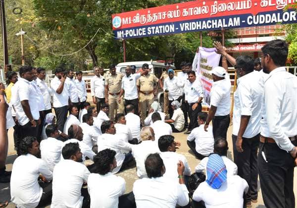 விருத்தாசலம் டவுன்போலீஸ் நிலையம் முன்பு டிஎஸ்பி பாலகிருஷ்ணனை கண்டித்து வழக்கறிஞர்கள் முற்றுகை போராட்டத்தில் ஈடுபட்டனர்.