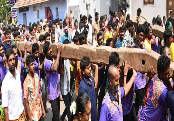 திருமுருகன்பூண்டி, திருமுருகநாத சுவாமி கோவிலில் தேர்த்திருவிழா வெகு விமரிசையாக நடந்தது. சண்ணை முட்டியை தூக்கி செல்லும் இளைஞர்கள்.