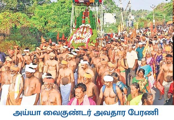 கன்னியாகுமரி மாவட்டம் சுவாமி தோப்பில் உள்ள அய்யா வைகுண்டரின் தலைமைப்பதிக்கு அவரது 194ம் அவதார தினத்தையொட்டி நாகர்கோவிலில் இருந்து பேரணியாக சென்ற பக்தர்கள்.