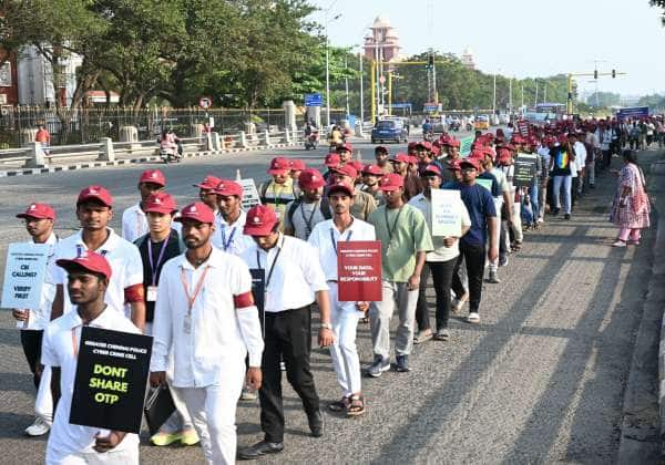 இணையவழி குற்ற தடுப்பு விழிப்புணர்வு பேரணி சென்னை மெரினா கடற்கரை சாலையில் நடந்தது. இதில் பேரணியில் பங்கேற்ற பல்வேறு கல்லூரி மாணவ மாணவிகள் பதாகை ஏத்தி சென்றனர்.
