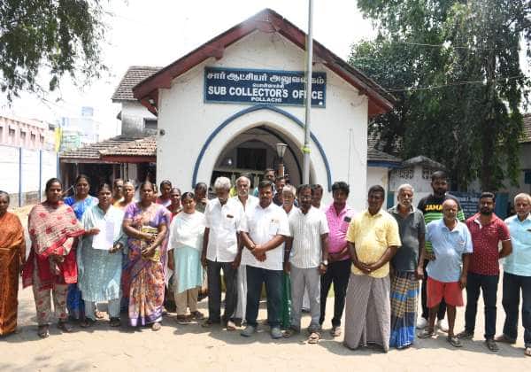 கோரிக்கைகளை வலியுறுத்தி பொள்ளாச்சி சப்-கலெக்டர் அலுவலகத்தில் மனு கொடுக்க வந்த மரம் பிடுங்கி கவுண்டனூர் மக்கள் .