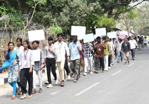 லாஸ்பேட்டை தாகூர் அரசு கலை மற்றும் அறிவியல் கல்லூரியில் நடந்த உலக மகளிர் தினத்தை முன்னிட்டு பெண்களுக்கான ரத்த சோகை விழிப்புணர்வு ஊர்வலம் சென்ற மாணவர்கள்.