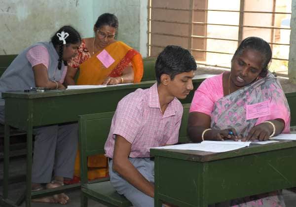 தேனி அல்லிநகரம் அரசு மாதிரி மேல்நிலைப்பள்ளியில் ஆசிரியர் உதவியுடன் 10ம் வகுப்பு அரசு பொதுத்தேர்வு எழுதிய மாற்றுத்திறனாளி மாணவர்கள்.