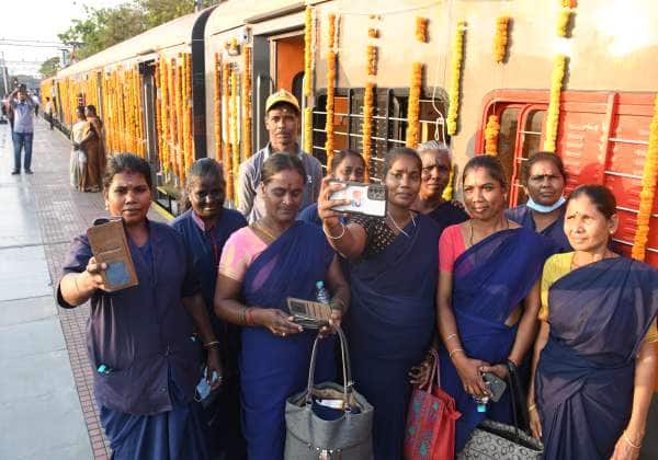 கோவை ரயில் நிலையம் வந்த அம்ரித் பாரத் எக்ஸ்பிரஸ் முன் புகைப்படம் எடுத்துக் கொண்ட ரயில் நிலைய ஊழியர்கள்.