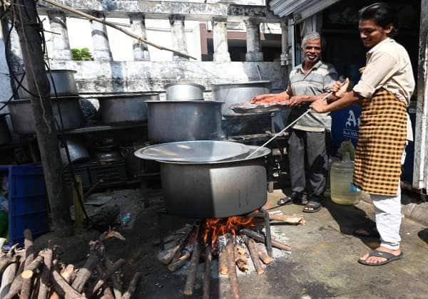 கேஸ் சிலிண்டர் தட்டுப்பாட்டால் ராஜீவ் காந்தி அரசு பொது மருத்துவமனையில் சிகிச்சை பெறும் கேன்சர் நோயாளிகளுக்கு உணவை விறகு அடுப்புகளில் சமைக்கின்றனர். இடம்: தங்கசாலை சென்ட்ரல்.