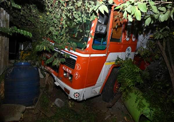 கோவை க.க., சாவடி பகுதியில் ஸ்ரீ நாராயணகுரு கல்லூரி எதிரே குடியிருப்புக்குள் புகுந்து விபத்துக்குள்ளான கேஸ் லாரி.