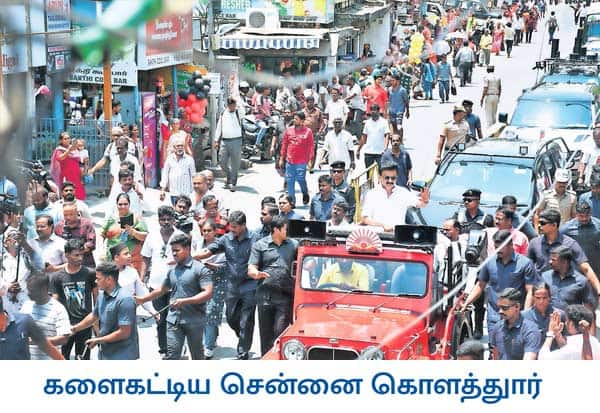 கொளத்தூர் தொகுதியில் முதல்வர் ஸ்டாலின் வேட்பு மனுவை தாக்கல செய்துவிட்டு, வாக்காளர்களை சந்திக்கும் வகையில் கையசைத்தபடி வந்தார்.