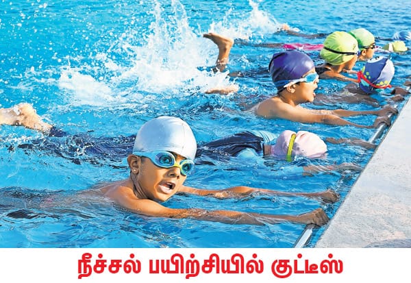 கோவை பாரதியார் பல்கலை வளாகத்தில் உள்ள நீச்சல் குளத்தில் துவங்கியுள்ள, கோடை கால நீச்சல் பயிற்சியில் கொண்டாட்டம் போடும் குட்டீஸ்.