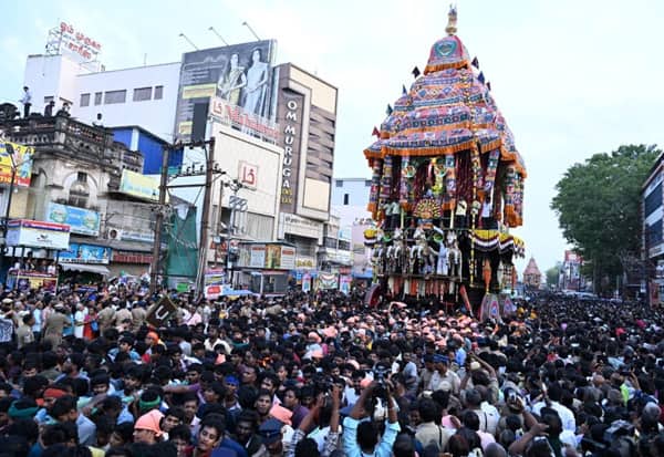 மதுரை மீனாட்சி அம்மன் கோயில் சித்திரை திருவிழா தேரோட்டத்தை முன்னிட்டு தேரில் எழுந்தருள கோயிலில் இருந்து புறப்பாடான அம்மன், பிரியாவிடையுடன் சுந்தரேஸ்வரர்.
