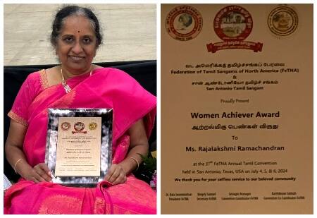 தினமலர் நாளிதழ் இணையதளத்தில் தொட்ர்ந்து எழுதி வரும் அட்லாண்டாவின் பழம்பெரும் லட்சுமி தமிழ்ப்பள்ளியின் துணை முதல்வர் ராஜலட்சுமி ராமச்சந்திரனுக்கு, அமெரிக்கத் தமிழ்ச் சங்கப் பேரவையின் (FeTNA - Federation of Tamil Sangams of North America) "ஆற்றல்மிகு பெண்கள் - 2024" விருது வழங்கப் பெற்றுள்ளது.