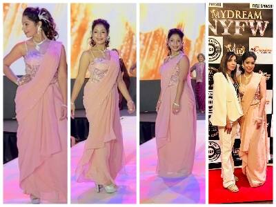 பாலிவுட் டிசைனர் ரோஸி அலுவாலியாவுக்காக நியூயார்க் ஹார்ட் ராக் ஹோட்டலில் நடைபெற்ற நியூயார்க் ஃபேஷன் வீக்கில் பங்கேற்ற இந்திய மாடல் பூரணி தஞ்சாவூர் ரமேஷ்
