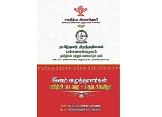 சாகித்ய அகாதெமி, தமிழ்நாடு திறந்தநிலைப் பல்கலைக்கழகம் இணைந்து நடத்தும் இளம் எழுத்தாளர்களுக்கான இரண்டு நாள் பயிற்சிப்பட்டறை நாளை தொடங்குகிறது. சென்னை, சைதாப்பேட்டையில் உள்ள தமிழ்நாடு திறந்தநிலைப் பல்கலைக்கழகத்தின் கூட்ட அரங்கில் நாளை (5.12.17) காலை பத்து மணிக்குத் தொடங்குகிறது.