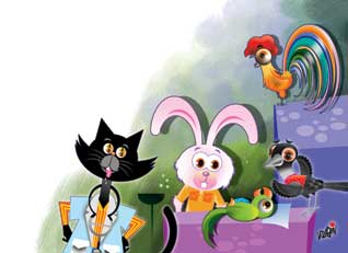 காகம் கண்ணம்மாவும், சேவல் செந்தாடியும் சேர்ந்து, கிக்கியம்மாவை கைத்தாங்கலாக அழைத்து வந்தன. கிக்கியம்மாவுக்குக் குடைபிடித்து வந்தது முயல் மொசமொசப்பன்.
