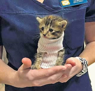 The kitten was rescued from the storm in Raleigh, North Carolina, and taken to Petsmart's Banfield Pet Hospital. Using a grey tube sock, the staff made the rescued animal a sweater. Images of the kitten were shared online after a Twitter user in the pet shop saw the feline wearing his warm ensemble.