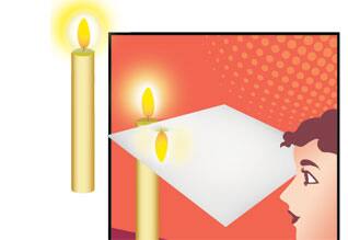 ஒரு மெழுகுவத்தியை ஏற்றிக்கொள்ளுங்கள். நல்ல வழவழப்பான வெள்ளைக் காகிதத்தை, தீபச் சுடரின் நேராக கிடைமட்டமாக வையுங்கள். கண்களைக் காகிதத்தின் மட்டத்தில் வைத்துப் பார்க்கச் சொல்லுங்கள்.