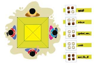 உடைத்த முத்துகள் நான்கு இருக்கும் அல்லவா, அதை குலுக்கிப் போட வேண்டும். அதாவது தாயக்கட்டை உருட்டுவதைப் போல.