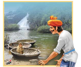 ஒரு குரங்கு தன் குட்டியோடு பரிசலில் உட்கார்ந்து இருந்தது.