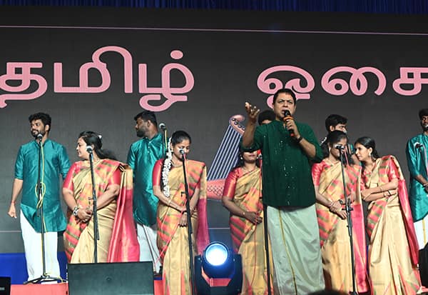 சங்கத் தமிழும்... புரட்சிக் கவியும்... அவ்வையாரின் 'நாலு கோடி பெறும்' பாடலும், கலித்தொகை, குறுந்தொகை பாடல்களும் மெல்லிசையில் நனைந்து வந்து செவிகளை நிறைத்தன. 'யாதும் ஊரே யாவரும் கேளிர்' என்ற கனியன் பூங்குன்றனாரின் உலகளாவிய தத்துவமே தமிழர்களின் தேசியப் பாடலாக மாற வேண்டும் என்ற முழக்கத்தோடு அந்தப் பாடல் பாடப்பட்டது.